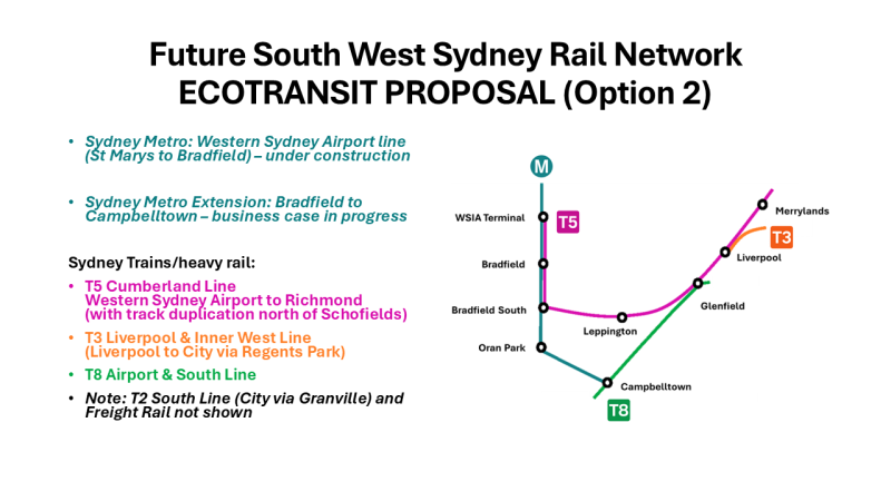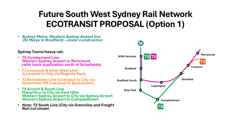 EcoTransit calls for an additional Western Sydney Airport International Terminal train station and Aerotropolis train station for Sydney Trains Network services either underground or above ground.